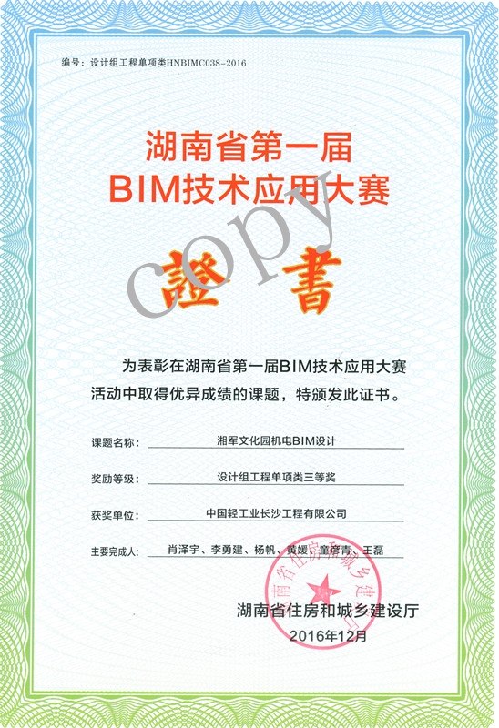 近期,由湖南省住房與城鄉(xiāng)建設(shè)廳主辦的2016年度湖南省第一屆BIM技術(shù)應(yīng)用大賽決賽暨表彰大會(huì)在長(zhǎng)沙隆重舉行。湖南省人民政府副省長(zhǎng)張劍飛、省國(guó)家住房和城鄉(xiāng)建設(shè)部、中國(guó)勘察設(shè)計(jì)協(xié)會(huì)等領(lǐng)導(dǎo)出席會(huì)議并先后發(fā)言。本屆大賽共有50家建設(shè)單位攜162個(gè)工程項(xiàng)目應(yīng)用課題參賽,全面展示了BIM技術(shù)在建筑、水電、市政、工業(yè)、交通等領(lǐng)域的應(yīng)用。我公司BIM中心提交的“湘軍文化園機(jī)電BIM設(shè)計(jì)”經(jīng)過(guò)層層篩選,喜獲設(shè)計(jì)單項(xiàng)組三等獎(jiǎng)。湘軍文化園項(xiàng)目位于長(zhǎng)沙市坪塘鎮(zhèn)曾國(guó)藩墓區(qū),總面積8252.5m²,項(xiàng)目為水下公共建筑,結(jié)構(gòu)形式為復(fù)雜空間網(wǎng)架及鋼筋混凝土結(jié)構(gòu)。項(xiàng)目最大難點(diǎn)是機(jī)電專業(yè)管線的排布及凈高控制,因業(yè)主和前期設(shè)計(jì)單位無(wú)法很好地解決該問(wèn)題,導(dǎo)致該項(xiàng)目自2014年停工至今。我公司BIM中心自2016年初介入該項(xiàng)目,耗時(shí)3個(gè)月,將空間充分利用,創(chuàng)造性地將管線隨屋面網(wǎng)架敷設(shè),騰出巨大空間,同時(shí)將項(xiàng)目存在的其余問(wèn)題全部理順,使得項(xiàng)目得以重新開展,受到業(yè)主及各方一致好評(píng)。該獎(jiǎng)項(xiàng)名至實(shí)歸。