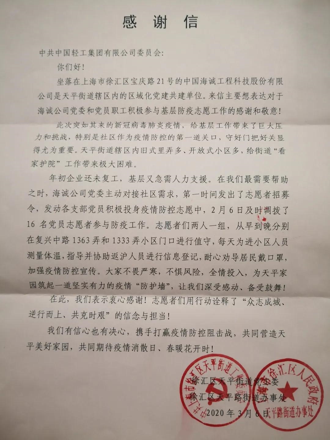近日,一封特殊的感謝信從上海寄到了中輕集團(tuán)黨委——感謝信來自上海市徐匯區(qū)天平街道,對海誠股份黨委和黨員職工積極參與基層防疫支援工作表示感謝和敬意。