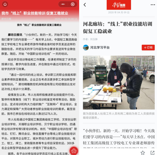 △“學習強國”河北學習平臺和《廊坊日報》分別對中國輕工集團高級技工學校 “開展企業(yè)新型學徒制線上教學,助力復工復產、穩(wěn)就業(yè)”的情況進行了相關報道