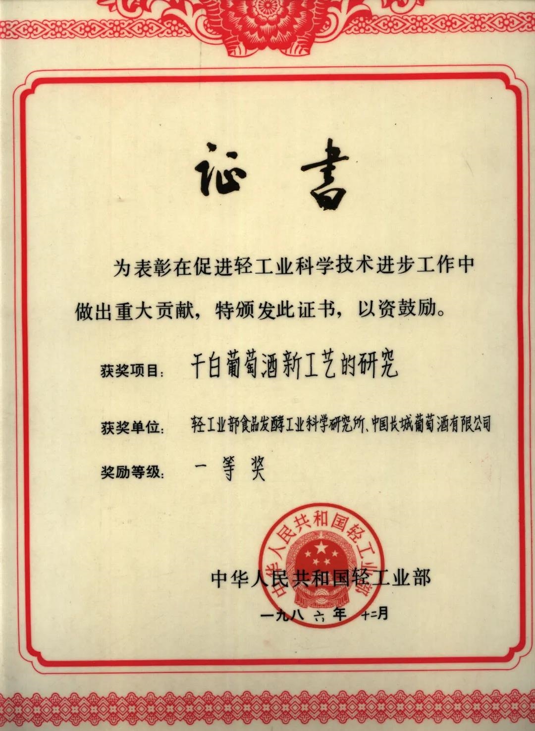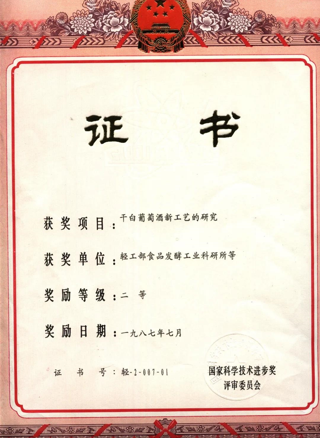 1979年,該葡萄酒獲得國家第三屆評酒會(huì)金獎(jiǎng)和國家質(zhì)量金獎(jiǎng);1983年在英國倫敦國際第14屆評酒會(huì)獲國際銀獎(jiǎng),這是70余年來我國酒類在國際上首次獲獎(jiǎng)。該項(xiàng)目1983年12月通過原輕工部科技局組織的技術(shù)鑒定,成果達(dá)到國際先進(jìn)水平,1987年榮獲國家科技進(jìn)步二等獎(jiǎng)。“中國第一瓶干白”的研制成功,不僅為國家培養(yǎng)了大批的專業(yè)技術(shù)人才,也為我國葡萄酒工業(yè)的發(fā)展壯大奠定了良好的基礎(chǔ)。