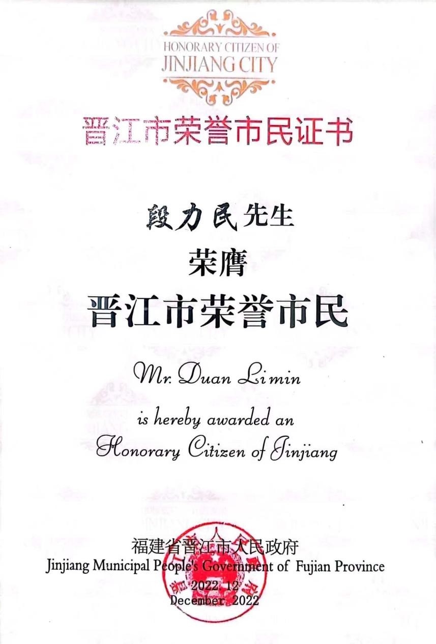 近日,福建省晉江市人民政府公布2022年度“晉江市榮譽(yù)市民”稱號(hào)人選8人,保利中輕所屬中國(guó)皮革制鞋研究院黨委書記、總經(jīng)理,中國(guó)皮革制鞋院晉江公司董事長(zhǎng)段力民榜上有名,被授予“晉江市榮譽(yù)市民”稱號(hào)。