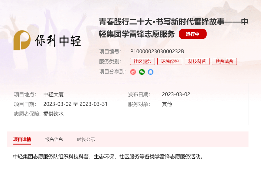 保利中輕總部組織建立青年志愿服務(wù)隊(duì),牽頭開展學(xué)雷鋒系列主題活動。指導(dǎo)廣大團(tuán)員青年進(jìn)行注冊并加入團(tuán)隊(duì),號召廣大團(tuán)員青年立足崗位、敬業(yè)奉獻(xiàn),接續(xù)傳承服務(wù)人民、助人為樂的雷鋒精神。