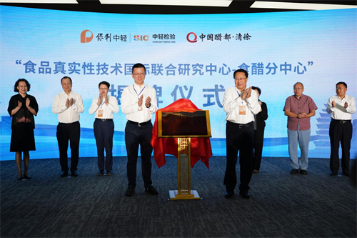 在與會(huì)領(lǐng)導(dǎo)和嘉賓共同見證下,太原市人大常委會(huì)副主任、清徐縣委書記王劍峰與中輕檢驗(yàn)總經(jīng)理趙紅峰共同為“食品真實(shí)性(FA)技術(shù)國際聯(lián)合研究中心——食醋分中心”揭牌。