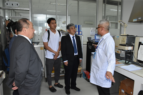 曹春昱一行首先來到柬埔寨國(guó)家科學(xué)技術(shù)創(chuàng)新實(shí)驗(yàn)室(STINL),參觀水化學(xué)檢測(cè)室、重金屬元素分析室、果汁及啤酒中試車間等實(shí)驗(yàn)室場(chǎng)所,詳細(xì)了解“一帶一路”聯(lián)合實(shí)驗(yàn)室運(yùn)行情況及此前中方援助設(shè)備使用情況。