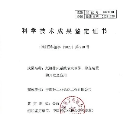 中國海誠3項科學(xué)技術(shù)成果通過中國輕工業(yè)聯(lián)合會鑒定,其中“紙機排風系統(tǒng)節(jié)水除霧、除臭裝置的開發(fā)及應(yīng)用”達到國際領(lǐng)先水平,“造紙廢渣資源綜合回收利用技術(shù)的開發(fā)與應(yīng)用”、“廢紙節(jié)能制漿技術(shù)產(chǎn)業(yè)化及關(guān)鍵設(shè)備綠色制造”達到國際先進水平。“紙機排風系統(tǒng)節(jié)水除霧、除臭裝置的開發(fā)及應(yīng)用”和“造紙廢渣資源綜合回收利用技術(shù)的開發(fā)與應(yīng)用”兩項成果已成功實現(xiàn)產(chǎn)業(yè)化應(yīng)用,并且后者已獲授權(quán)發(fā)明專利2件、實用新型專利1件。