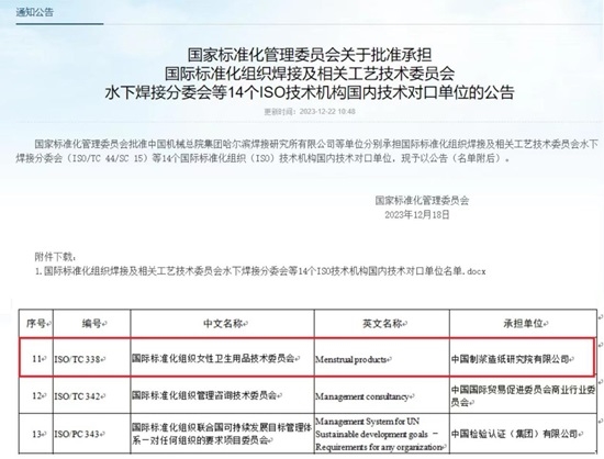 中國制漿造紙研究院承擔的“國際標準化組織女性衛(wèi)生用品技術(shù)委員會(ISO/TC 338)”負責女性衛(wèi)生用品領(lǐng)域的國際標準化工作,涵蓋所有一次性使用和多次使用的女性衛(wèi)生用品,包括衛(wèi)生巾(護墊)、衛(wèi)生棉條、月經(jīng)杯、女性衛(wèi)生褲等,共有參與成員國27個,觀察成員國17個,我國是參與成員國。