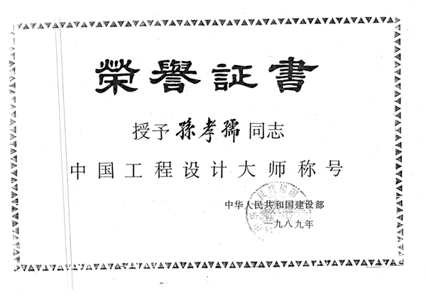 1989年,原國(guó)家建設(shè)部授予孫孝孺“中國(guó)工程設(shè)計(jì)大師”稱號(hào)