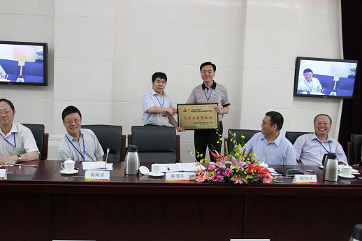 (陳鄂生董事長向海誠股份公司總裁嚴曉儉授先進黨組織榮譽牌匾)