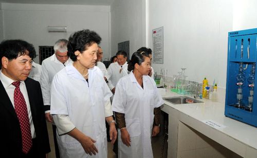 陳鄂生董事長陪同國務(wù)委員劉延?xùn)|(中)、柬埔寨副首相梅森安(右一)參觀實(shí)驗(yàn)室(一)