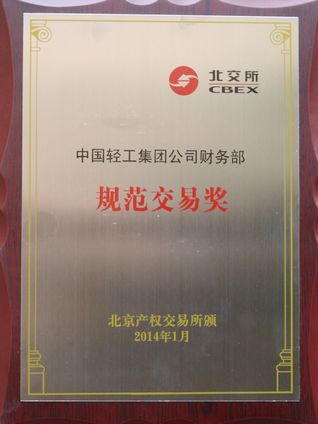 2014年1月北京產(chǎn)權(quán)交易所對25家國有產(chǎn)權(quán)交易規(guī)范操作的央企進行表彰,中輕集團財務(wù)部獲規(guī)范交易獎。