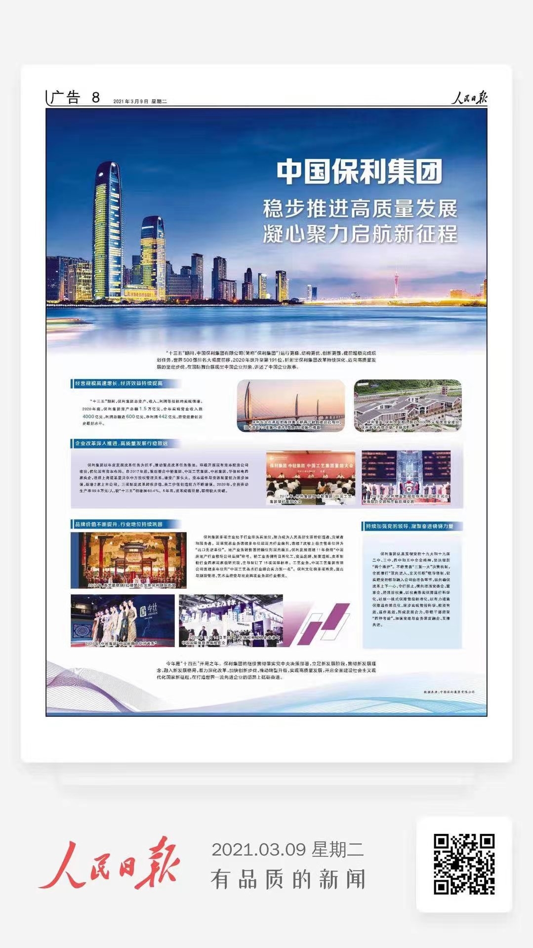 今年是“十四五”開局之年。保利集團將繼續(xù)貫徹落實黨中央決策部署,立足新發(fā)展階段,貫徹新發(fā)展理念,融入新發(fā)展格局,著力深化改革,加快創(chuàng)新步伐,推動轉(zhuǎn)型升級,實現(xiàn)高質(zhì)量發(fā)展,開啟全面建設(shè)社會主義現(xiàn)代化國家新征程,在打造世界一流先進企業(yè)的道路上砥礪奮進。