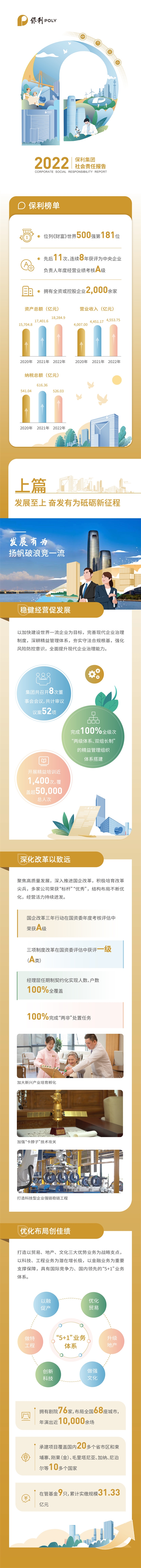 近日,保利集團(tuán)發(fā)布2022社會(huì)責(zé)任報(bào)告,并獲中國(guó)企業(yè)社會(huì)責(zé)任報(bào)告評(píng)級(jí)專家委員會(huì)五星評(píng)級(jí)。報(bào)告解讀改革發(fā)展、科技創(chuàng)新、生態(tài)治理、保障民生等領(lǐng)域的履責(zé)效能,向社會(huì)各界展現(xiàn)出保利以擔(dān)當(dāng)致美好的堅(jiān)實(shí)步伐。