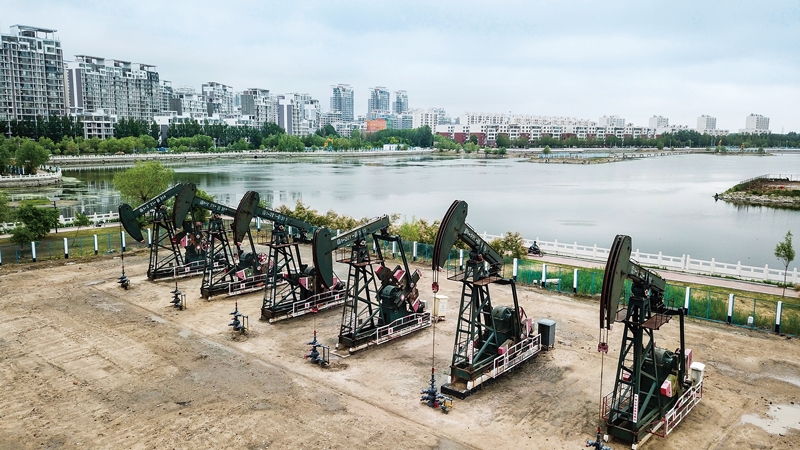 經(jīng)過半個多世紀艱苦創(chuàng)業(yè),大慶油田不僅扛起了“共和國加油機”的神圣職責,為保障國家能源安全作出巨大貢獻,而且著力打造了一座人與自然和諧相處、原油生產(chǎn)與環(huán)境保護相得益彰的“綠色油化之都”。圖為大慶油田叢式井坐落在市區(qū)燕都湖旁。 新華社記者 王建威/攝